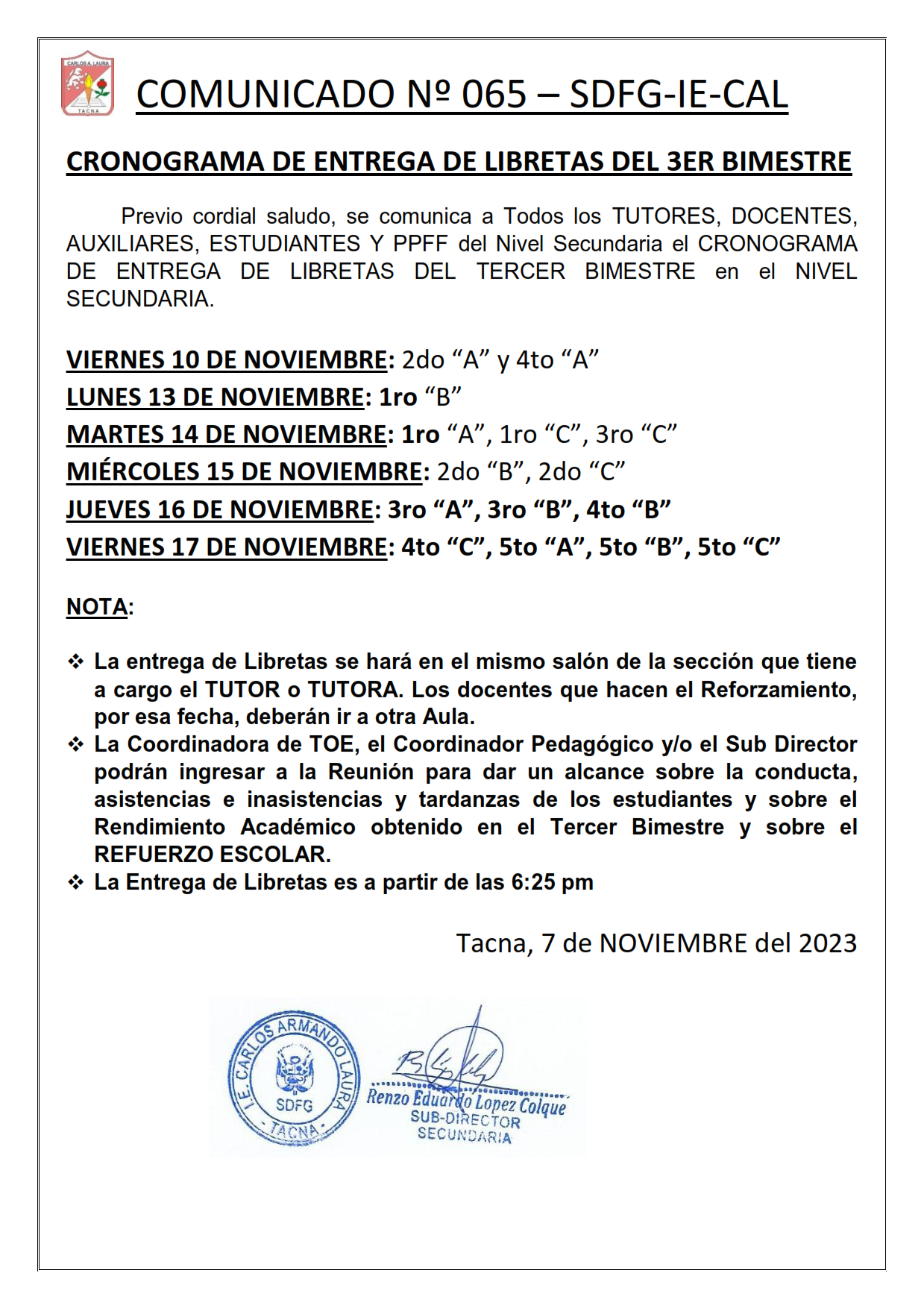 Comunicado N° 065-SDFG-IE-CAL "Cronograma de entrega de libretas del 3er bimestre Secundaria"