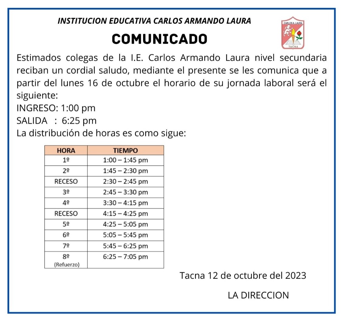 Comunicado nivel secundario, cambio de horario a partir del Lunes 16 de octubre de 2023