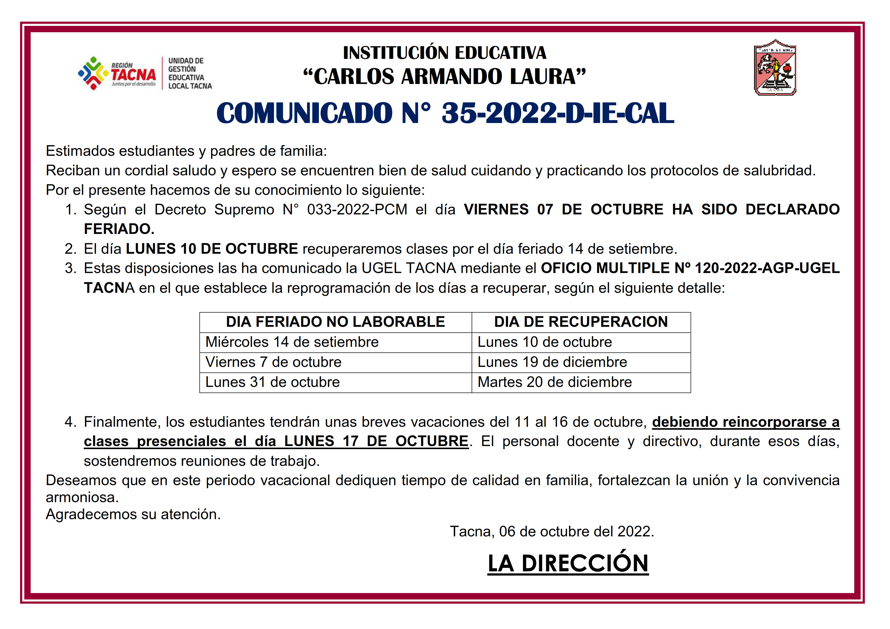 Comunicado N°35-2022-D-IE-CAL: Feriado Viernes 07/10/2022, Recuperación Lunes 10/10/2022 e inicio periodo vacacional