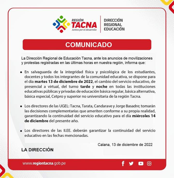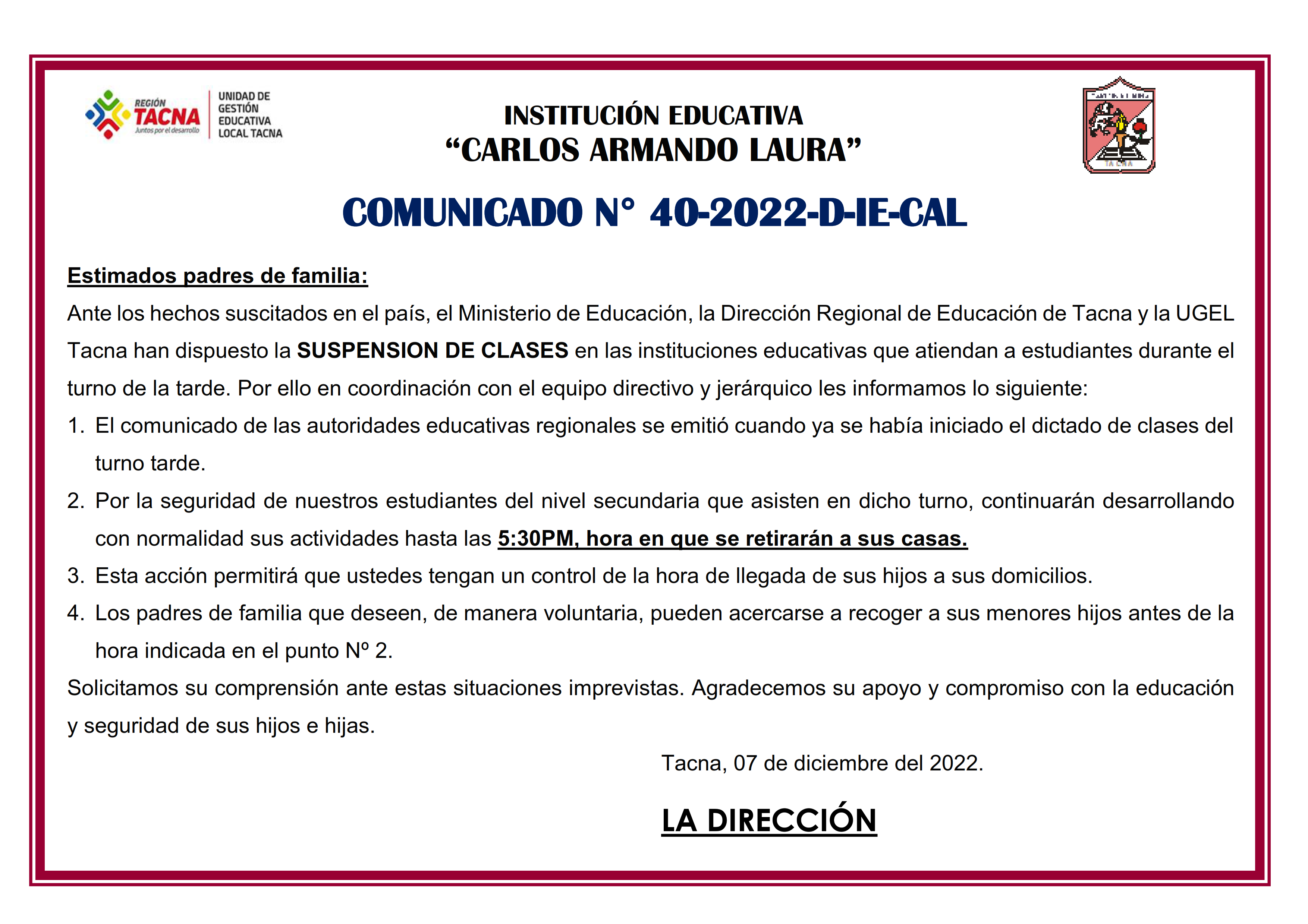COMUNICADO N° 40-2022-D-IE-CAL - Suspensión de clases a partir de las 5:30pm de Hoy miercoles 07 de diciembre de 2022
