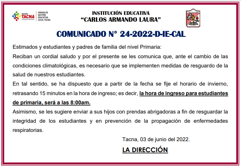 Comunicado Nro. 24-2022-D-IE-CAL Horario de Invierno