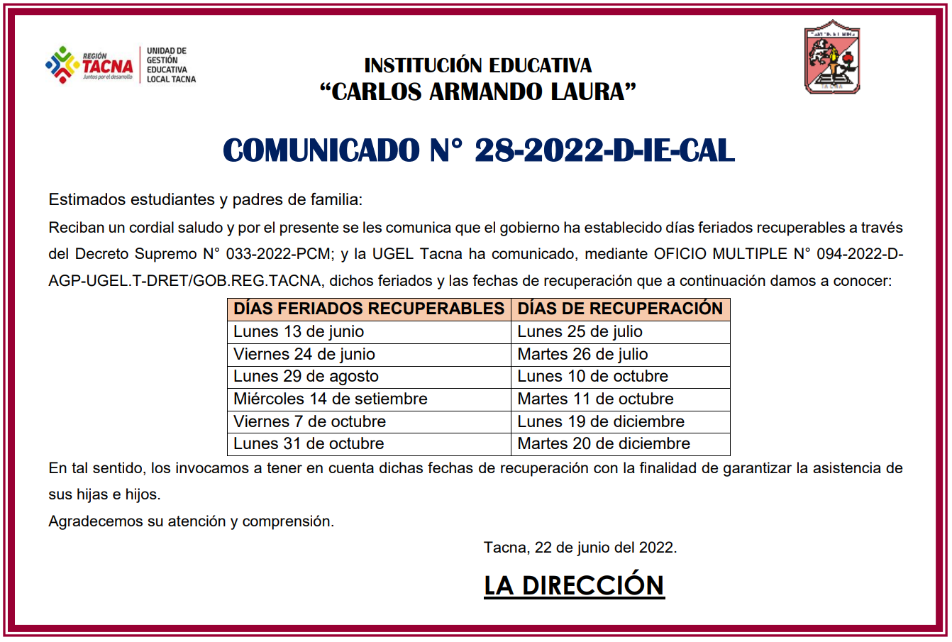 Comunicado Nro 28-2022-D-IE-CAL "Días feriados recuperables"