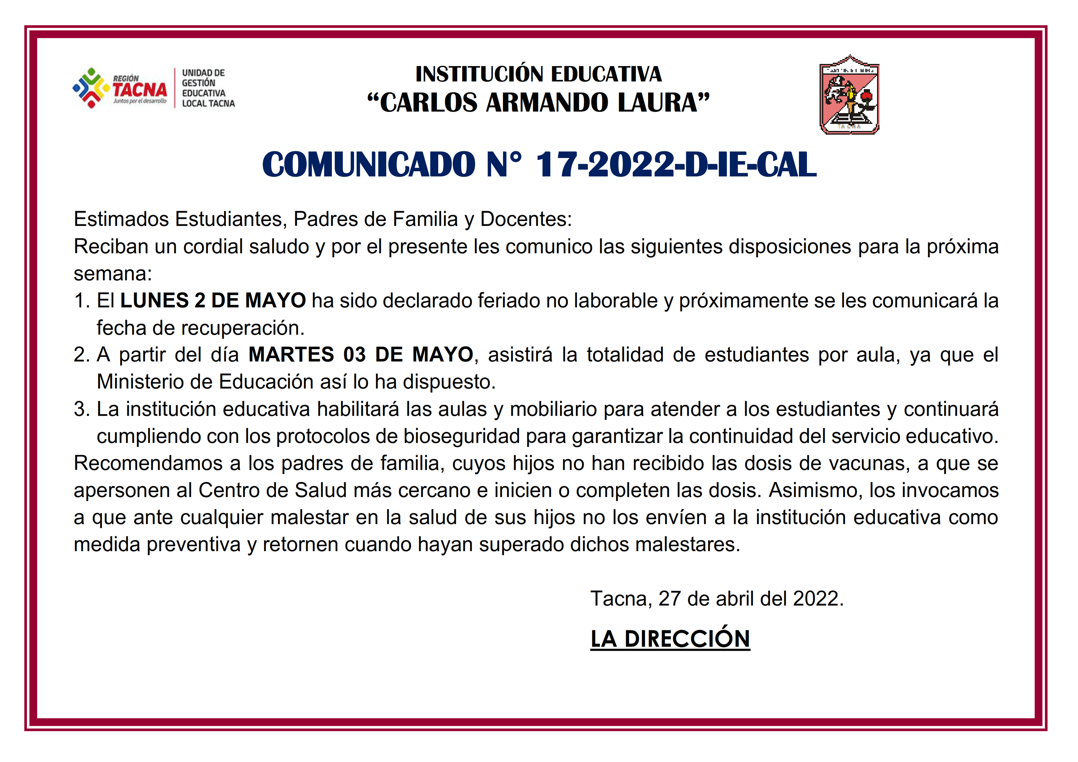 Comunicado Nro. 21-2022-D-IE-CAL. Feriado No Laborable el Jueves 26 de mayo del 2022 - No Recuperable.
