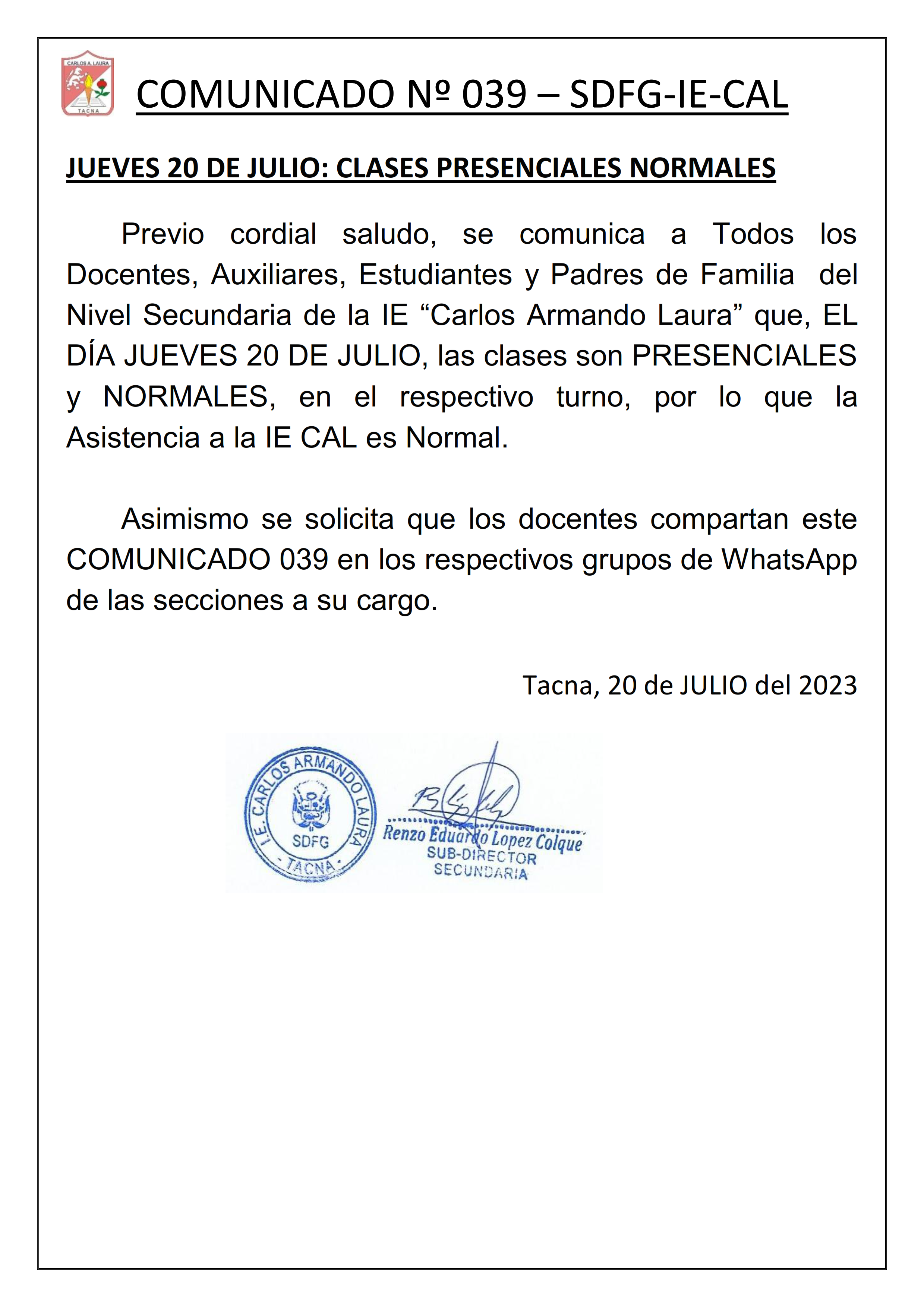 COMUNICADO Nro. 08-2023-D-IE-CAL "Recuperación de Clases Viernes 26 de Mayo del 2023"