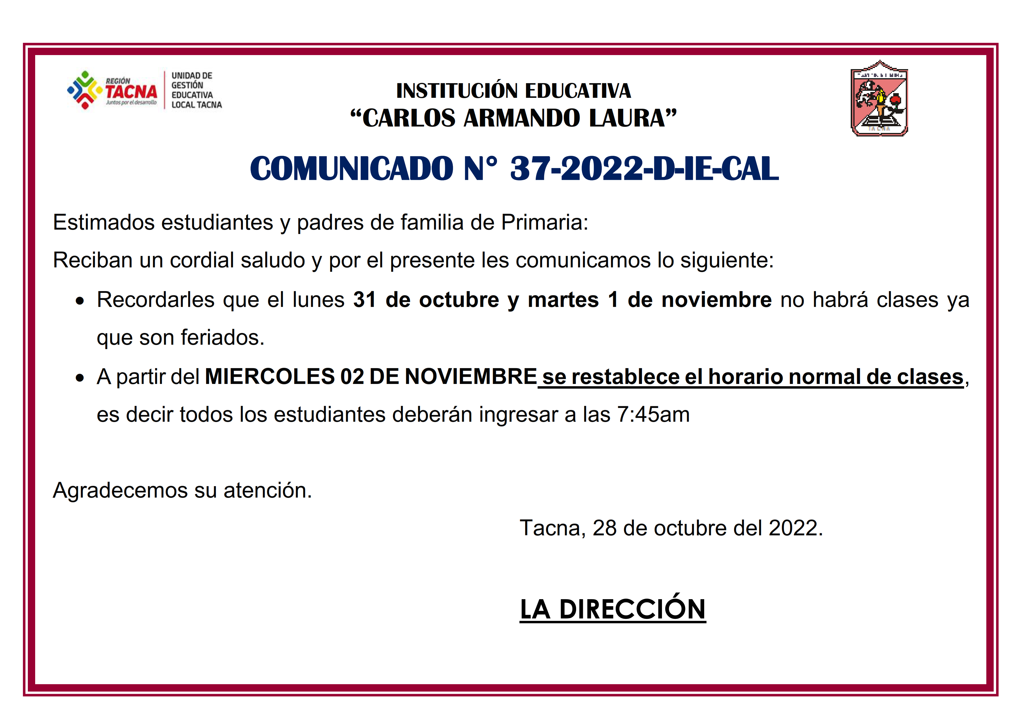 Comunicado N° 37-2022-D-IE-CAL "Feriado 31 de Octubre y 1 de Noviembre del 2022; también a partir del miércoles 02 de noviembre el ingreso será a las 7:45 am" "