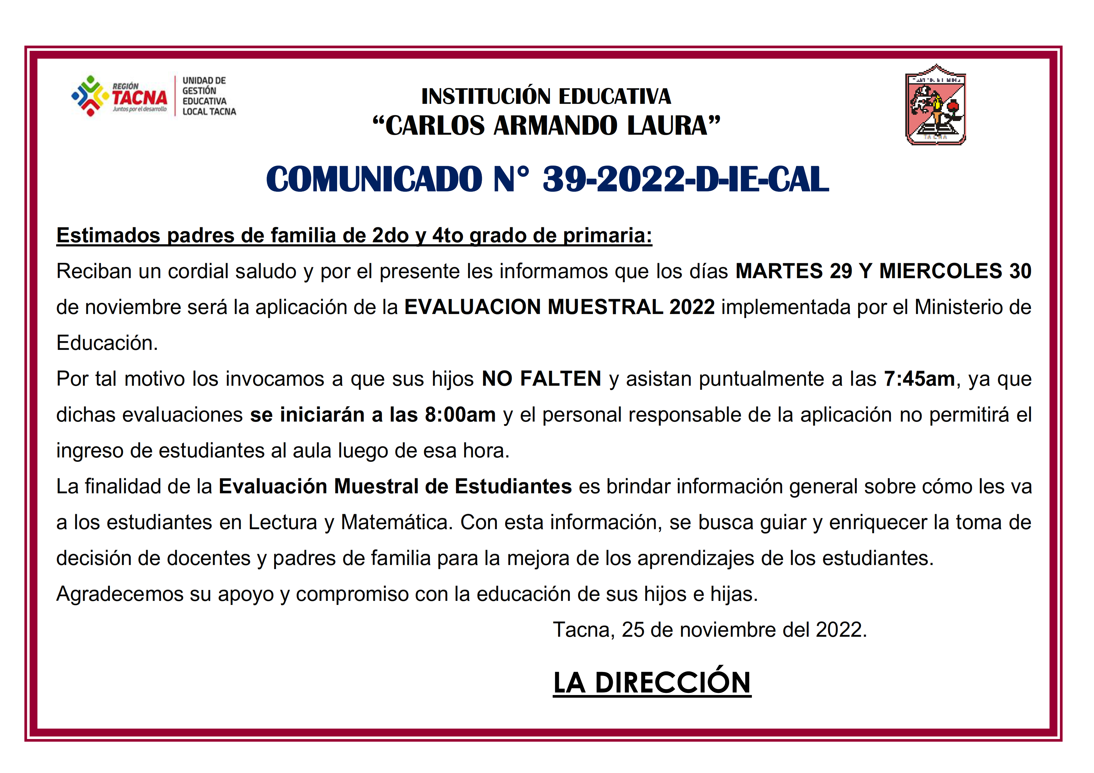 COMUNICADO N°39-2022-D-IE-CAL "Martes 29 y Miércoles 30 de noviembre EVALUACIÓN MUESTRAL 2022 PRIMARIA"