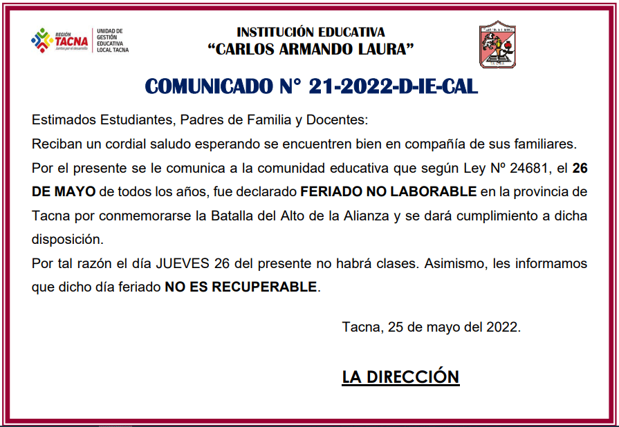 Comunicado Nro. 21-2022-D-IE-CAL. Feriado No Laborable el Jueves 26 de mayo del 2022 - No Recuperable.