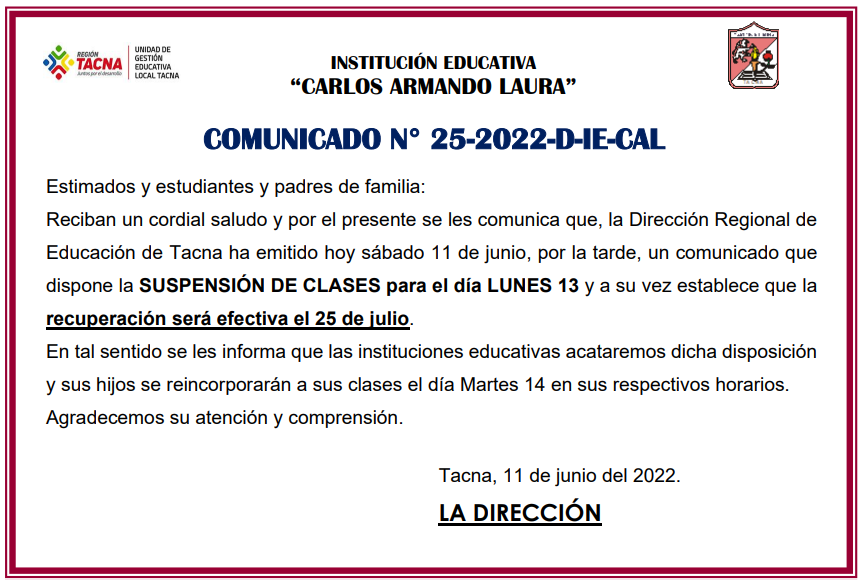 Comunicado Nro. 25-2022-D-IE-CAL-Feriado Lunes 13 junio de 2022